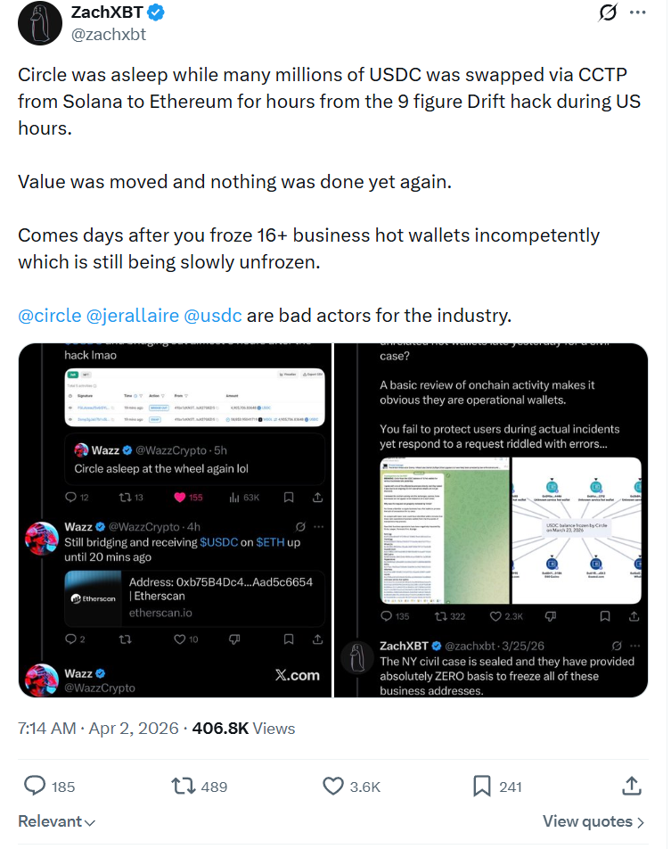 Tâm điểm tranh cãi sau đó lại không nằm hoàn toàn ở hacker, mà chuyển sang Circle – đơn vị phát hành USDC. Nhiều ý kiến trong cộng đồng cho rằng Circle đã không phản ứng đủ nhanh để đóng băng lượng USDC bị đánh cắp, dù các giao dịch diễn ra trong khoảng thời gian đủ dài để can thiệp.