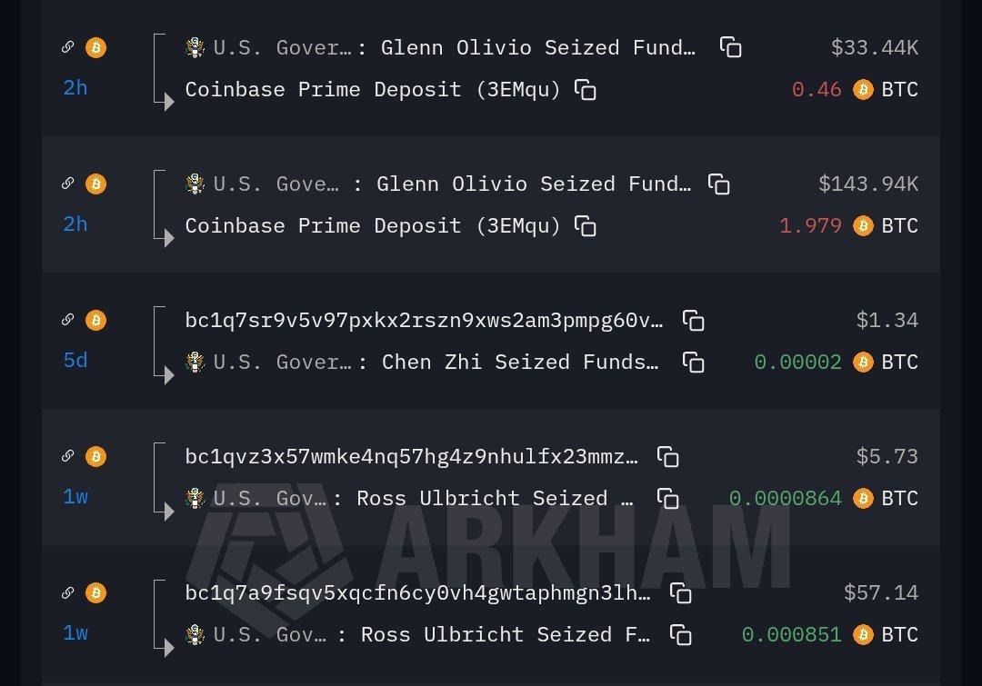 Gần đây, dữ liệu on-chain ghi nhận Chính phủ Mỹ đã chuyển 2.4 BTC (~177.000 USD) lên Coinbase Prime. Số tài sản này được Arkham Intelligence liên kết với Glenn Olivio, cá nhân bị truy tố trong năm 2025 liên quan đến một đường dây steroid.