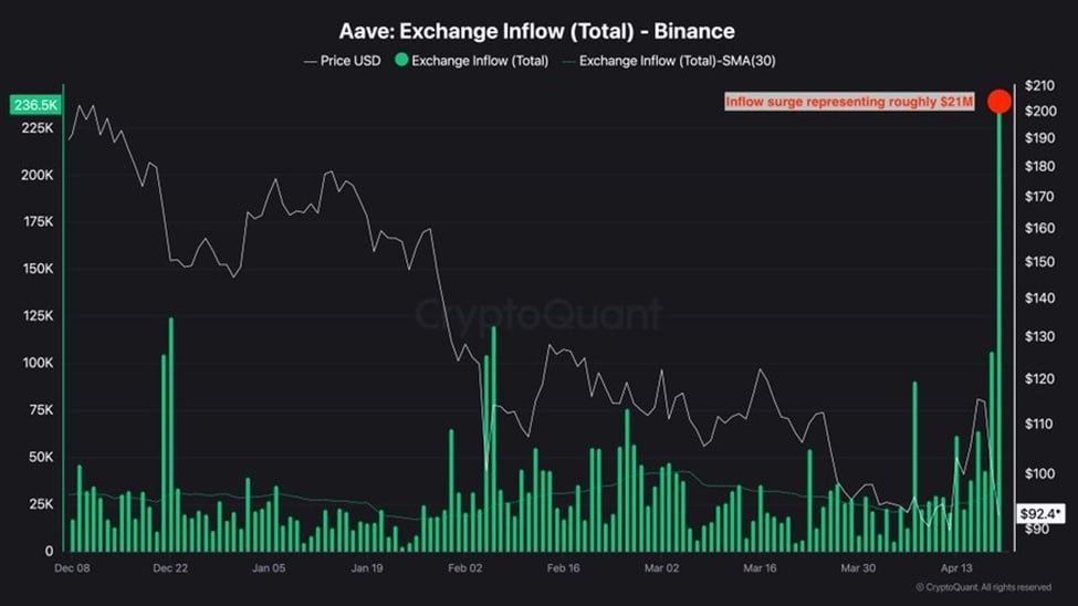 Niềm tin suy giảm còn thể hiện qua hành vi holder token AAVE. Lượng AAVE nạp lên sàn giao dịch (chủ yếu Binance) tăng đột biến, vượt xa mức trung bình hàng tháng.
