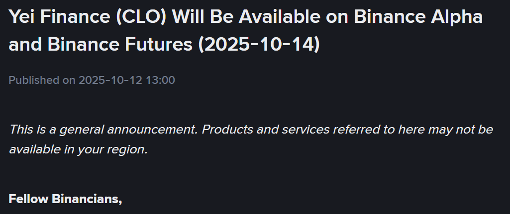 Binance cho biết CLO sẽ được niêm yết trên Binance Alpha vào lúc 18 giờ ngày 14/10 (theo giờ Việt Nam) và sau đó 30 phút sẽ list Binance Futures với đòn bẩy tối đa lên tới 50x. Giao dịch Futures. sẽ được hỗ trợ chế độ Multi-Assets Mode, cho phép người dùng dùng BTC hoặc USDT làm tài sản ký quỹ. Người dùng có thể claim airdrop CLO trên trang Alpha Events trong vòng 24 tiếng, kể từ 18 giờ ngày 14/10 đến 18 giờ ngày 15/10 (theo giờ Việt Nam).