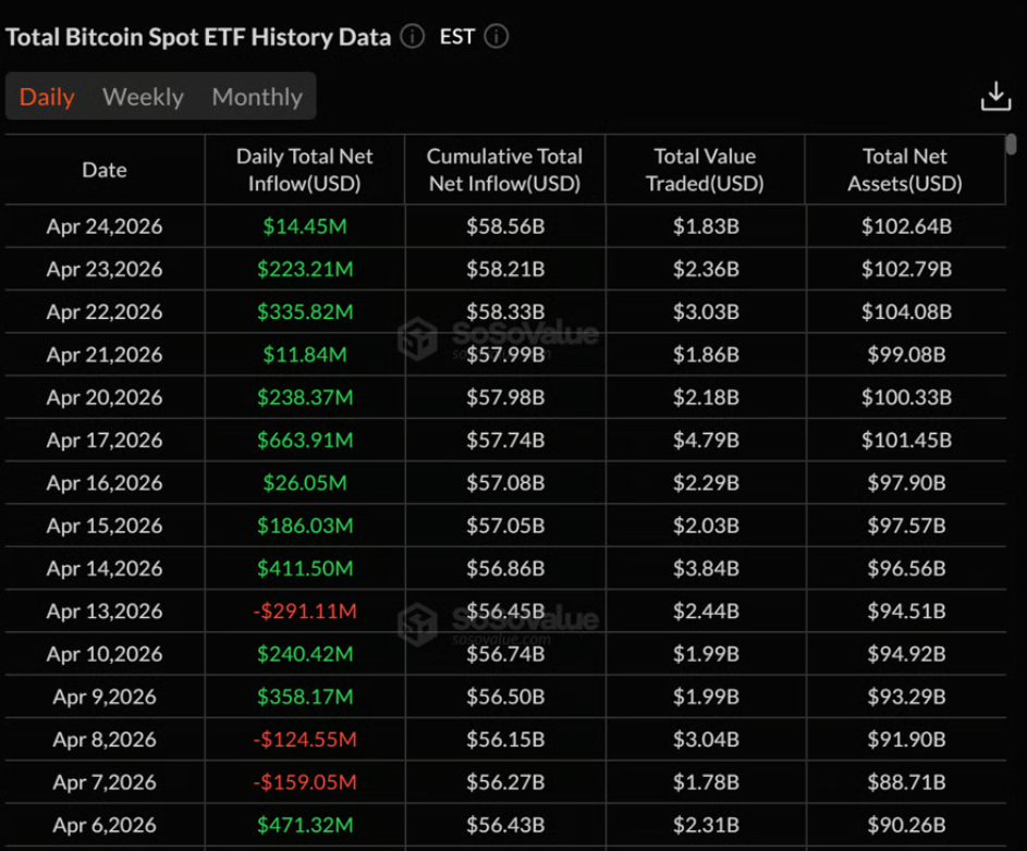 Tính riêng trong phiên giao dịch gần nhất, tổng giá trị tài sản ròng đổ vào các quỹ này đã lên tới hàng trăm triệu USD. Đây là minh chứng rõ nét cho thấy nhu cầu sở hữu Bitcoin thông qua các kênh chính thống vẫn đang ở mức rất cao.