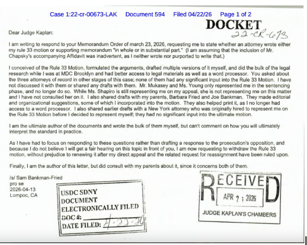 ơn xin xét xử lại (Rule 33 Motion) ban đầu được nộp vào tháng 3 bởi mẹ của Bankman-Fried. Trước đó, ông cũng đã nộp đơn kháng cáo từ tháng 11, nhưng đến nay vẫn chưa có tiến triển rõ ràng.